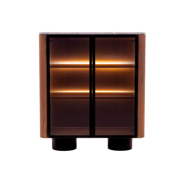 Buffet con cubierta en mármol, laca microtextura, madera de freijó, nogal o carvalho. Puertas en vidrio con iluminación interna. Cuerpo en madera de freijó, nogal o carvalho o laca microtextura.