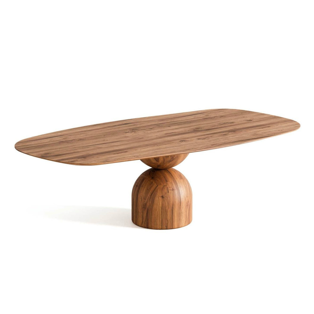 La base está hecha de un bloque de madera maciza trenzada y torneada. La cubierta puede ser asimétrica, disponible en versiones enchapadas en lámina de madera o mármol. Terminaciones disponibles, acero, nogal, nogal ebanizado o urban grafeno. Opciones de cubierta en mármol.